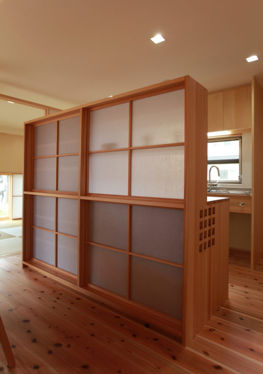 前にもこのキノイエブログのどこかで触れられていましたが、この障子はかの建築界のレジェンド「吉村障子」の変形バージョンなのです。