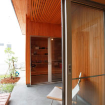 右手に見える四角い小窓のある空間が「離れ」。玄関土間~庭~カーポートをつなぐハブのようなスペースで、想像以上の利便性があります。