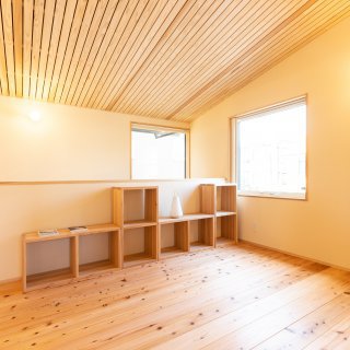 空間を広く見せる為に視線が抜けるようにし、扉や壁で部屋を仕切らず天井の高低差で空間を仕切る。仕切りのない空間は途切れることなく続き、コンパクトで無駄のない家になります。
