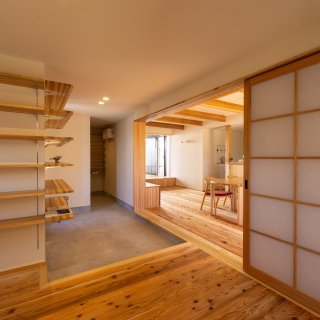糸魚川杉の板塀の隙間から校庭で遊ぶ児童たちの笑い声がこぼれる南庭、大きく伸びた軒下に広がるデッキ、やわらかな反射光に包まれる樹木が美しい北庭・・・視線の抜けはもとより、天気の良い日は全開放された南北の窓から心地よい風が通り抜ける居間空間は、畳数では計れない想像以上の広がりを感じることができます。