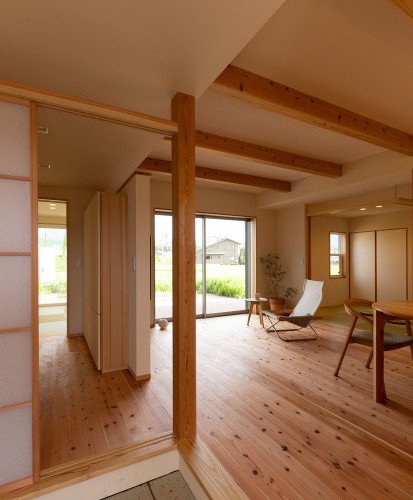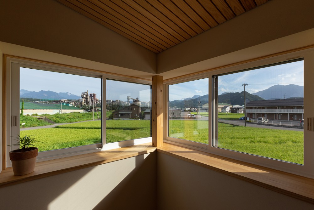 [糸魚川市上刈地内] 昔からずっとそこで暮らしていたかのような佇まい。眼下に広がる田園と地元の工場、そして山々の景色を眺める窓越し。その床に腰を下ろしただけで感じるこの落ち着きは、昔子どもの頃に体験したおじいちゃんおばあちゃんの家のような懐かしさと居心地にも似た感覚を彷彿とさせます。新しいのにどこか人工的でない懐かしさを感じる住まいです。